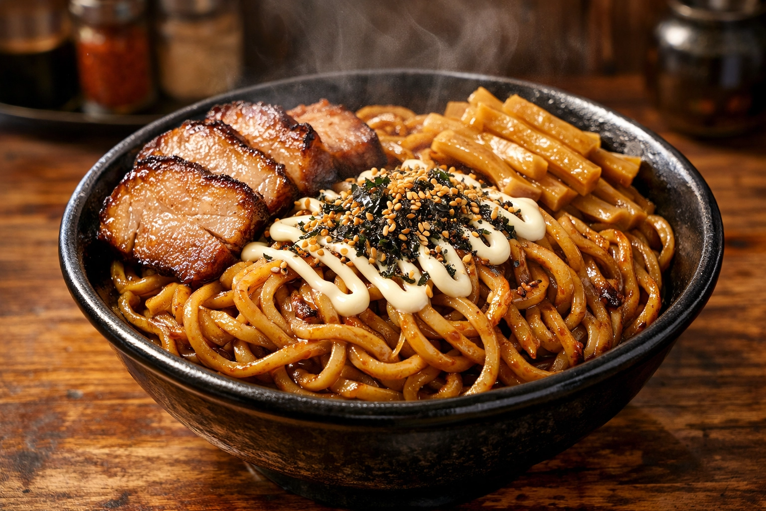 「明星 ぶぶか油そば」は、その極太麺と濃厚なタレ、そして特製マヨネーズとふりかけが織りなすハーモニーが絶妙な逸品です。一度食べたらやみつきになること間違いなし!ぜひ一度、この中毒性のある美味しさを体験してみてください。