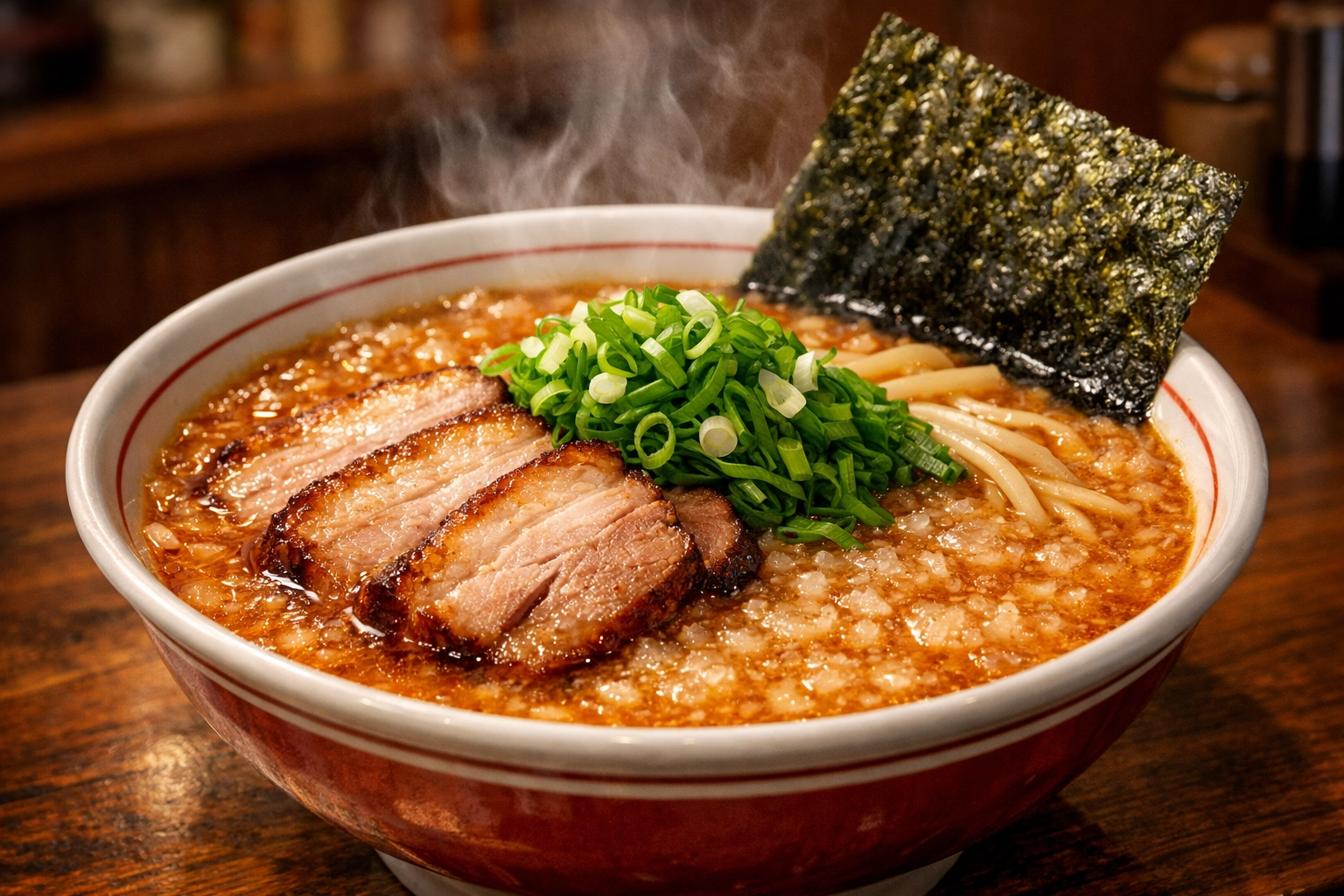 ドアを開けた瞬間、強烈な豚骨の香りが鼻をくすぐります。最初は驚くかもしれませんが、数分もすればこの香りが食欲をそそるスパイスに変わるから不思議です。